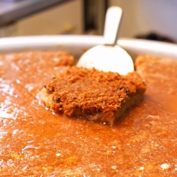Daheen has a fudge-like texture and consists of flour, milk, sugar, clarified butter, and date syrup. Before serving, daheen is traditionally sprinkled with desiccated coconut.