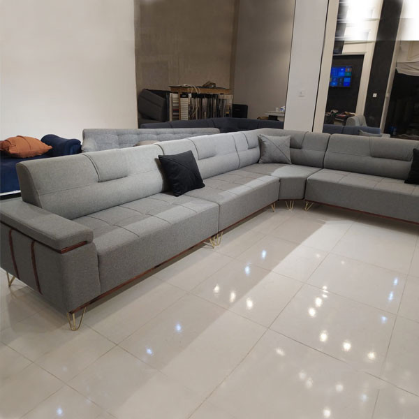 - Product: Comfortable Linen Fabric Corner Gray Sofa with Dents, of High Quality Sponge & Golden Colored Metallic Base Legs (price per meter)