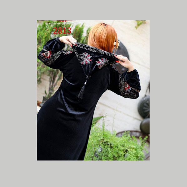 Fallaha New Collection Single Black Color Abaya with Black Beads Belt & Gray-Red Embroidered Flower & Shape Designs on 2 Sleeves & Abaya's Scarf Model No. 2813