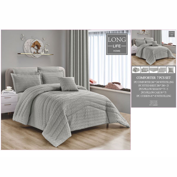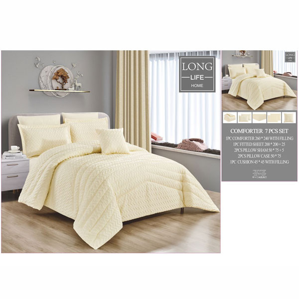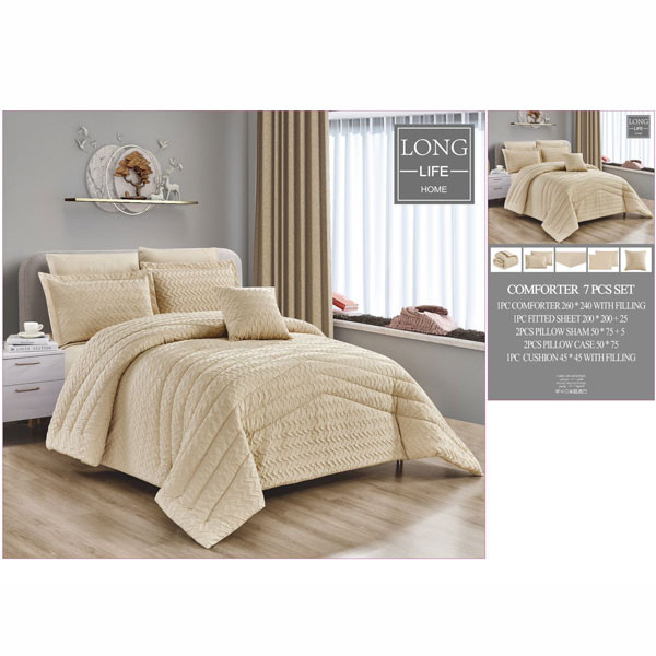 - Brand: Long Life Home - Model Number: N/A - Product: Comforter Set of 7 pieces (Comforter, Filted Sheet, 2 Pillow Cases, 2 Pillow Shams, Cushion) in many Colors & Designs - Composition: 70% Cotton & 30% Polyester The set consists of: 1 Comforter 260x240cm 1 Fitted sheet 200x200cm+25cm 1 Cushion: 45x45cm with Filling 2 Pillowcases 50x75cm 2 Pillow swam 50x75cm+5cm with Filling - Product care: Wash them at 30ºC Do not use chlorine Tumble dry on low heat Avoid dry cleaning Iron at a temperature up to 150ºC.