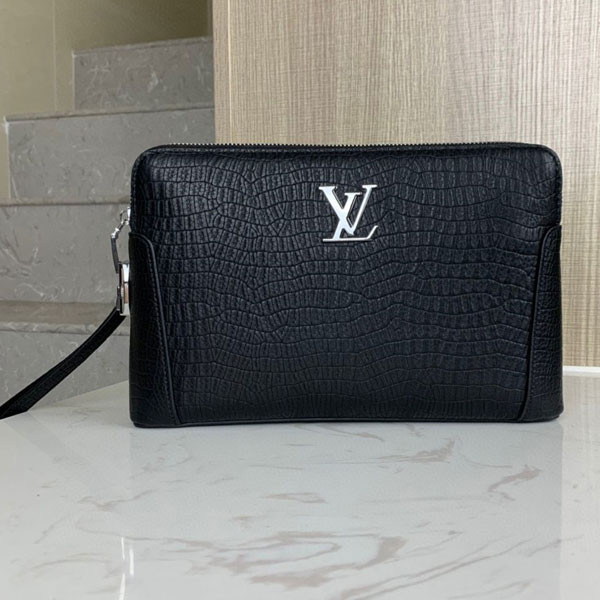 - Black leather signature LV logo plaque fold over top single rolled top handle floral appliqué metal feet silver