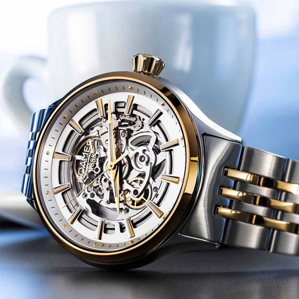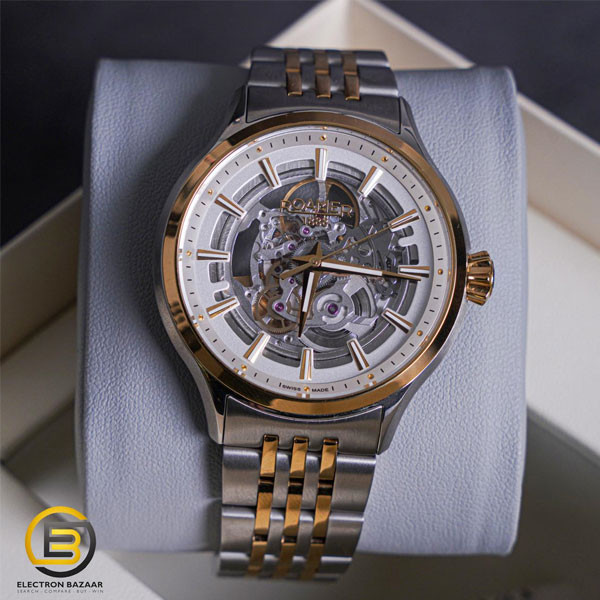 - The Roamer Competence Skeleton III has a silver-colored, 42.5 mm diameter, 316L stainless steel case and a gold-colored flange . There are no sharp edges, the curves are finely crafted, and the case tabs almost blend in with the watch strap. Due to the automatic structure, the thickness of the watch case is quite massive, reaching 13 mm, while the weight of the watch is 130 g. The strap, also made of stainless steel, is 21 mm wide and made of solid links stands Viewed in width, it consists of 7 elements. Four pieces of silver wire drawn and three pieces of gold-colored eyes polished to a shine. It is comfortable to wear and gives the impression of an absolutely premium watch.