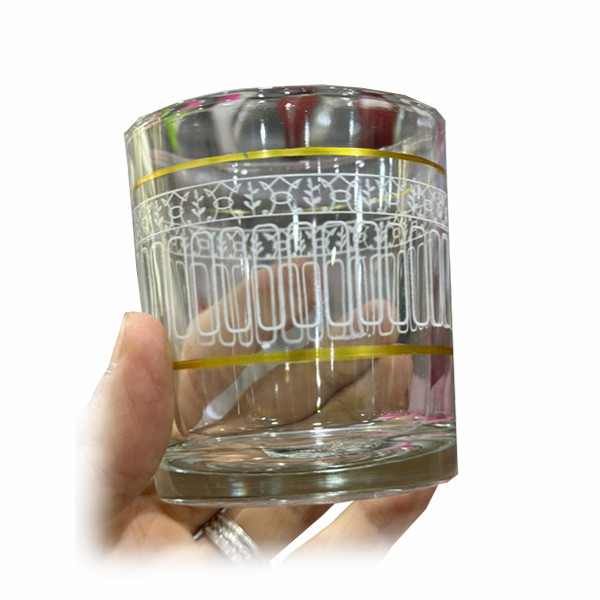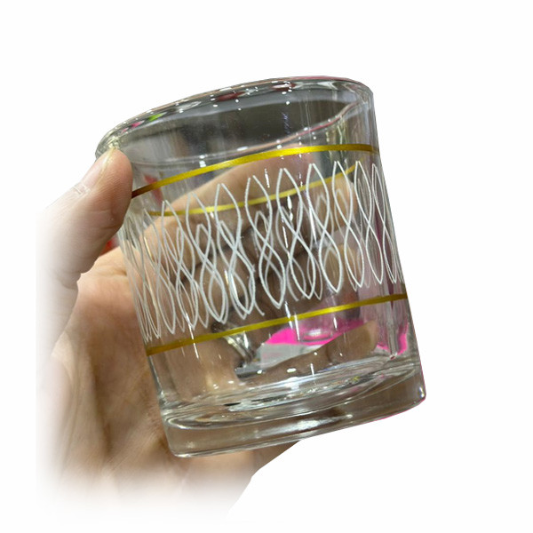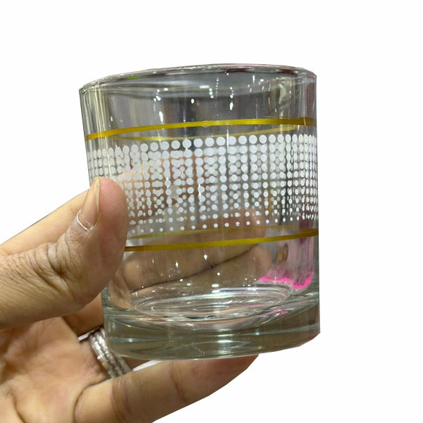 - Set of 6 Short Size Water Glasses with 2 Golden Round Circles & Various of Small White Color Shape Designs (in 5 Different Designs)